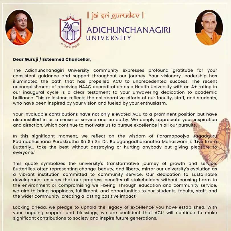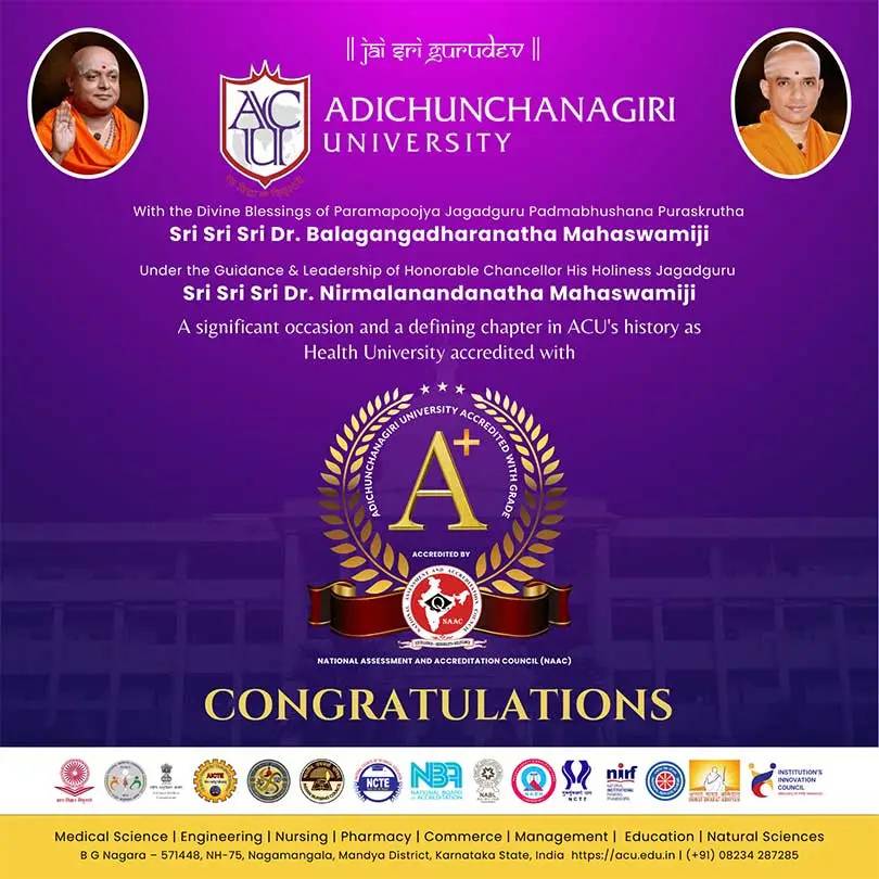 This multidisciplinary private university owes its genesis to the profound vision of the revered Jagadguru Sri Sri Sri Dr. Balagangadharanatha Mahaswamiji, the 71st Pontiff of Sri Adichunchanagiri Mahasamsthana Math. Inspired by a noble dream, he envisioned a dynamic learning hub that fosters not only intellectual growth but also equips students with valuable skills. Equally important, ACU strives to preserve India’s rich cultural and spiritual heritage, ensuring a holistic educational experience.